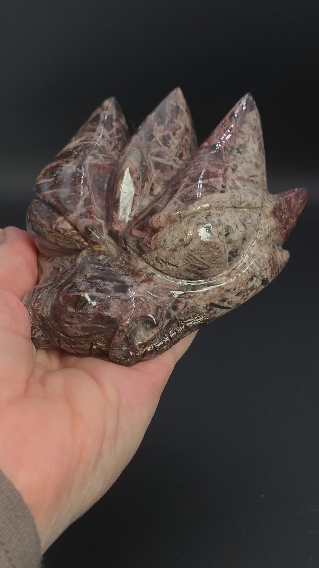 This Leandro De Souza Fascia Jasper Dragon is the grandaddy of them all (except for the two gigantic 100#1s, of course!). He is large and in charge, with a commanding presence and beautiful dark coloring. His right eye has a square, a rectangle, and a triangle inside, and the back side has a cave, some matrix, and fabulous geometric patterns.