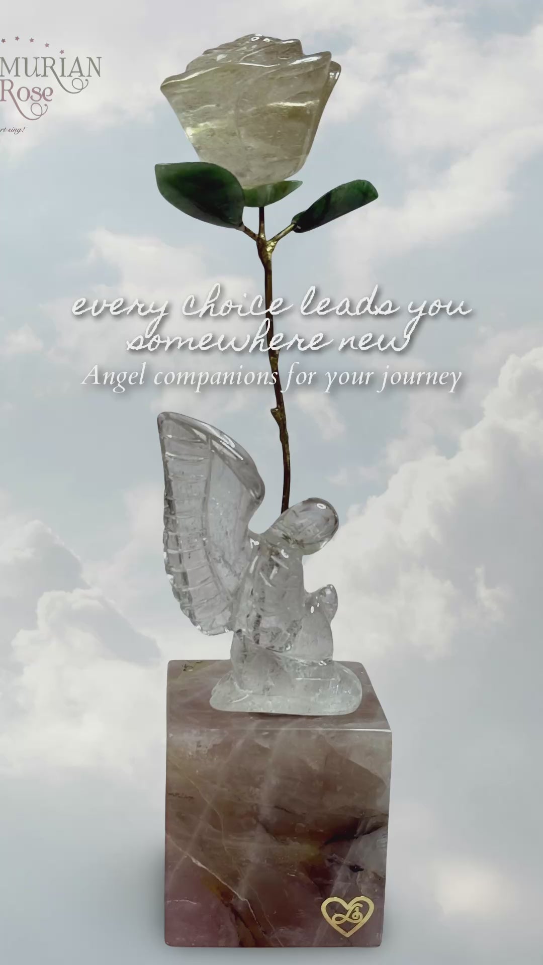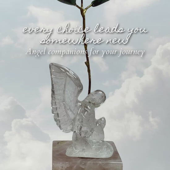 Beautiful kneeling angel carved from water clear Lemurian quartz with a Sirius quartz rose that is filled with rainbows! Master carved by Leandro De Souza on a carbon included rose quartz (lab tested) base with insignia.