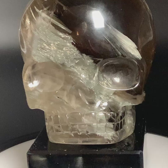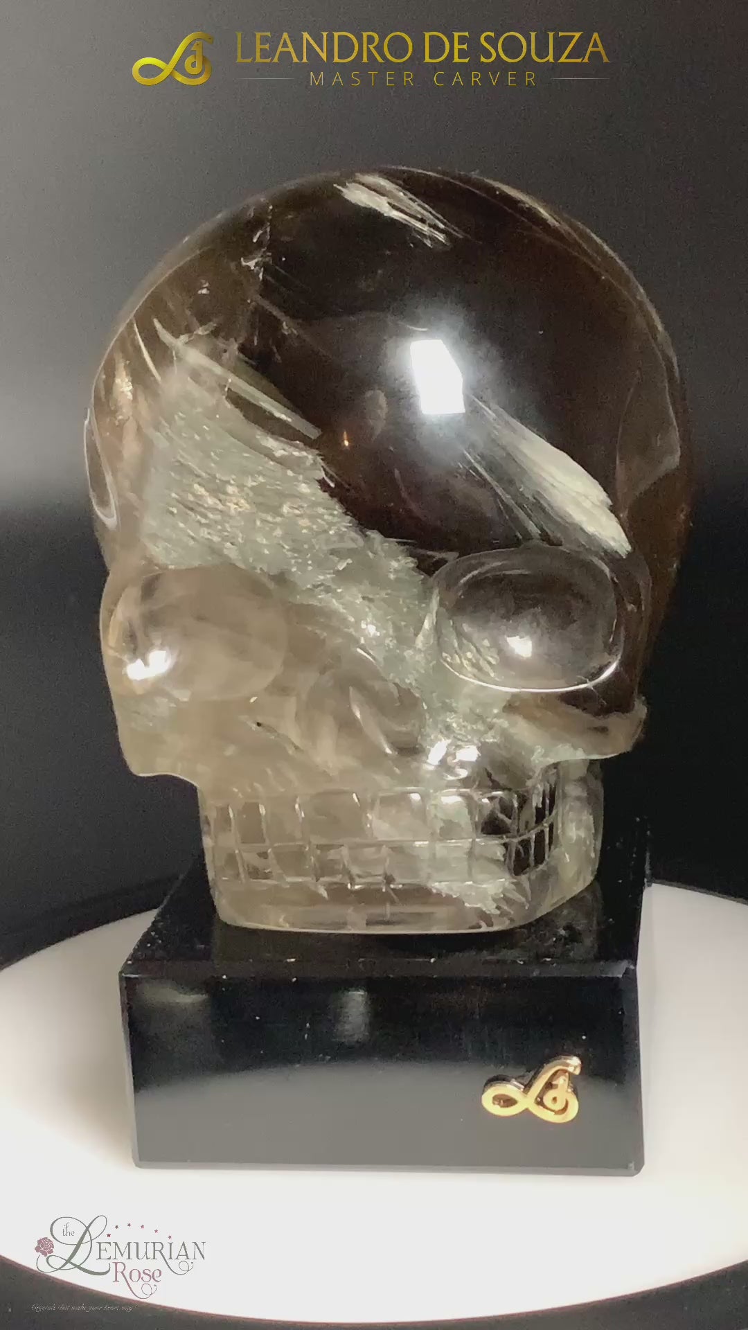 A mesmerizing treasure carved by renowned artist Leandro De Souza—this light smoky quartz skull is adorned with windswept wispy gray inclusions. This being carries a sweet and graceful energy signature that captivates from the moment you encounter it.