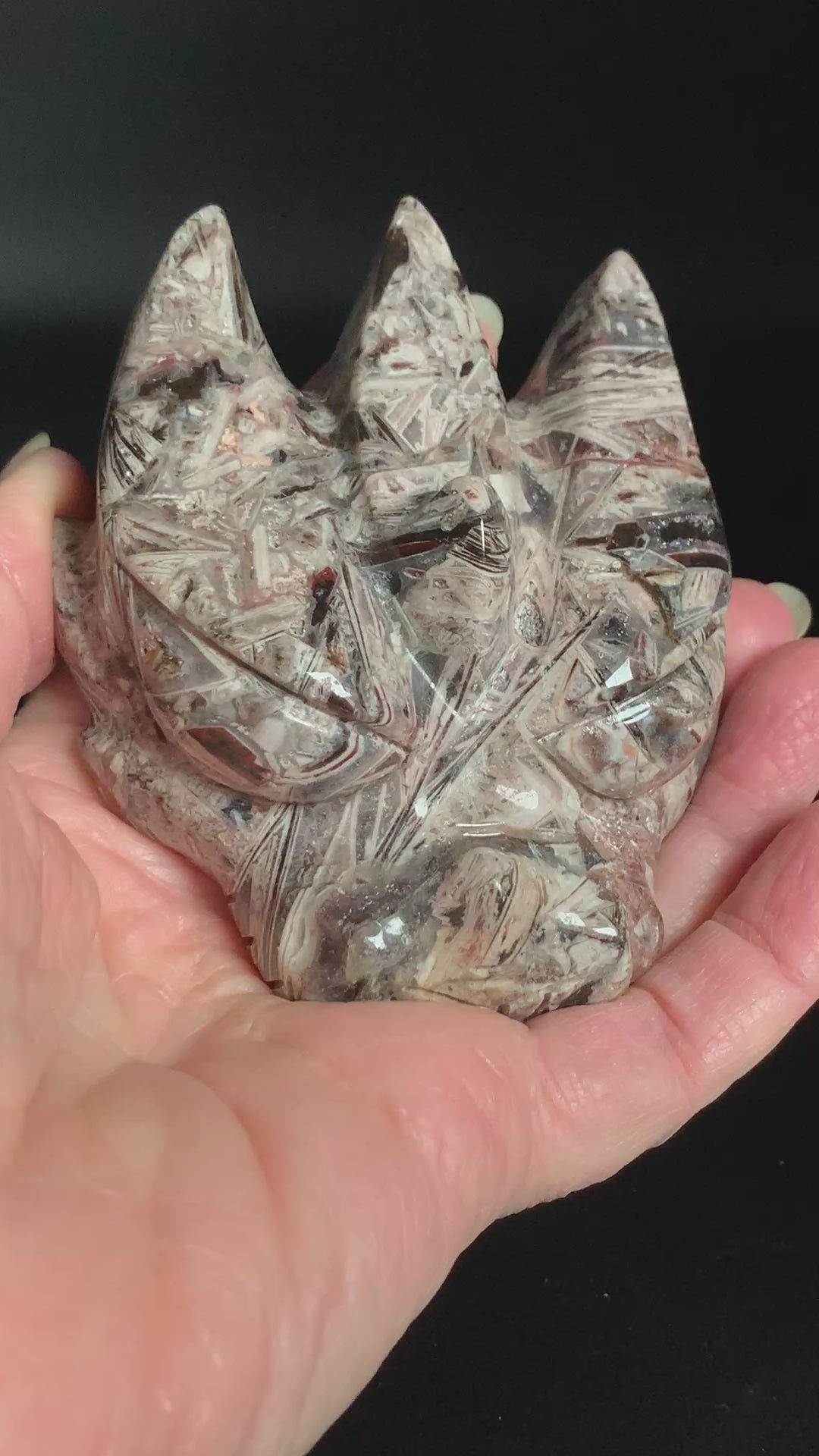 This Leandro De Souza Fascia Jasper Dragon has a very small cave by the left eye, gorgeous markings, and a hexagon and a triangle in his right eye! there are also several areas of light transitional amethyst.